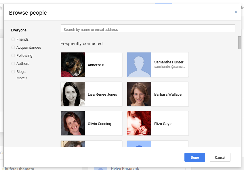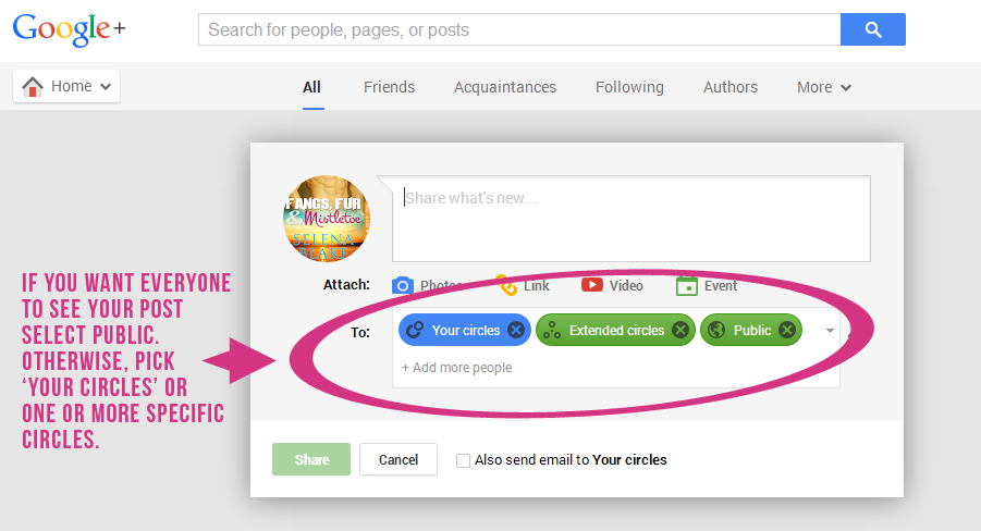 When you click add more people a list of all your circles and communities pops up. When I say communities, I’m talking about groups that you’ve joined on google + like a group of paranormal romance readers. There are lots of communities, so if you have a specific interest, do a search for it.