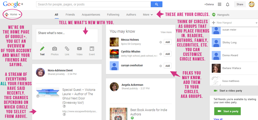This one shows you a few key features of the Home Page of your Google + profile. This is the default page you see when signed in to your personal profile account. I won’t repeat everything I wrote in pink, but if you have questions, leave a comment.